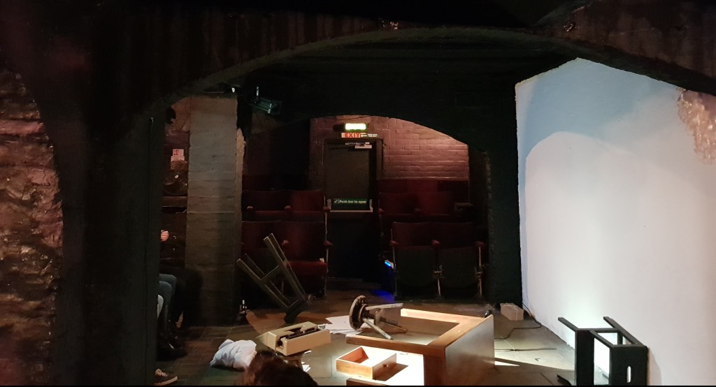 On my continued mission to absorb Mikhail Bulgakov’s complete oeuvre on stage I am in the vaults under the Curtain Up pub in Kensington which hosts the Barons Court Theatre underneath. It is my first visit here and after a German version in Zurich and a subtitled performance in Russian the first time I see Bulgakov being played in English. Hosting an audience of sixty I take my seat and when I hear the wood creak it feels like I arrived in the setting of a horror movie set, shot without sound and in black and white.