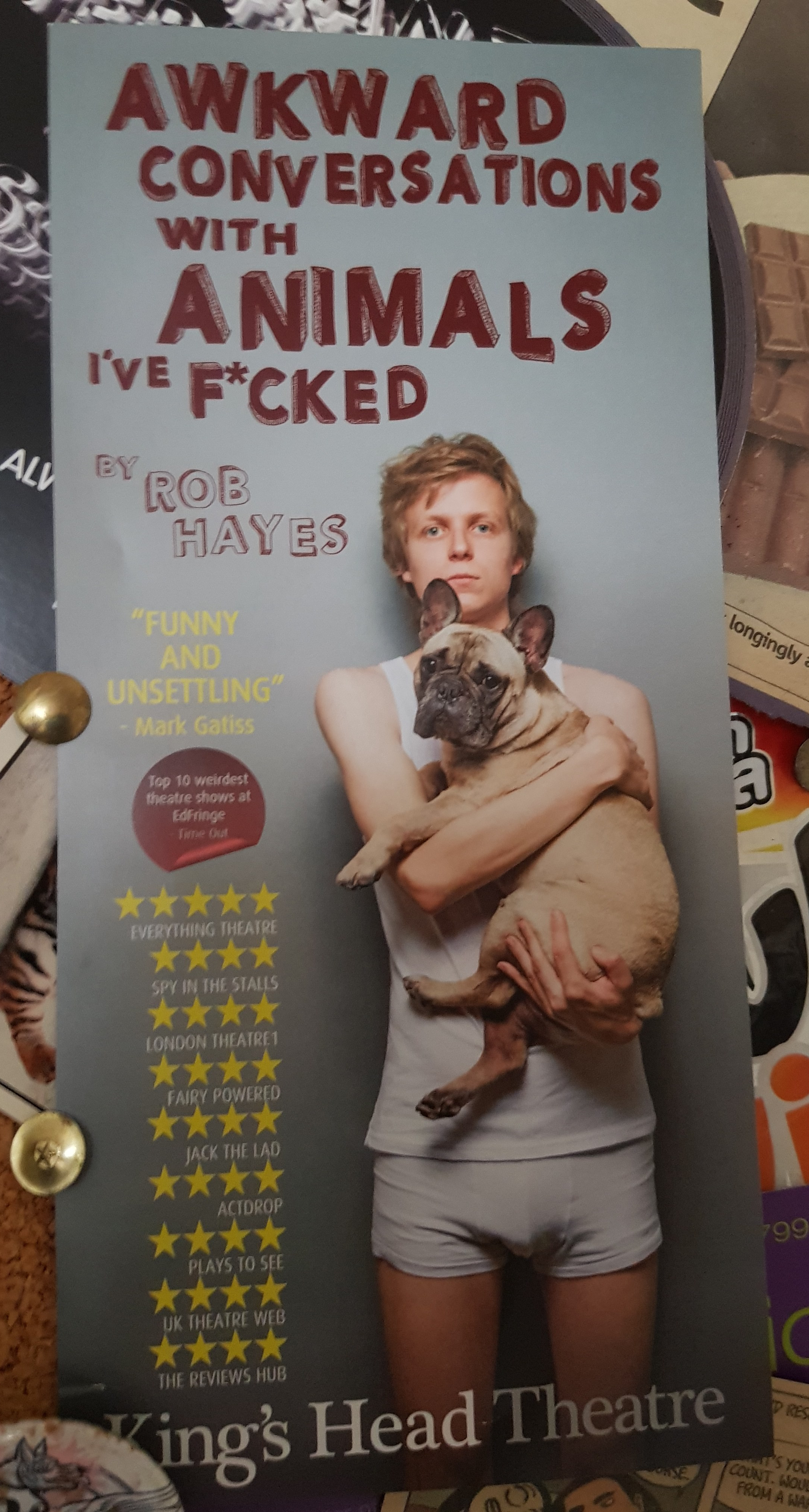Inside, I am surprised how big the stage is for tonight’s monodrama “Awkward conversations with Animals I f***ed”. Flyers, posters and tweets promise a grotesque comedy and I have agreed to see it because my favourite Woody Allen short film is about a dentist who falls in love with a sheep named Daisy and ends up heartbroken and drinking wool detergent (it also led to the discovery that sodomy mean different things in German and English but that is another topic).