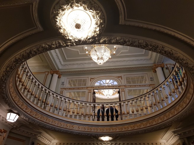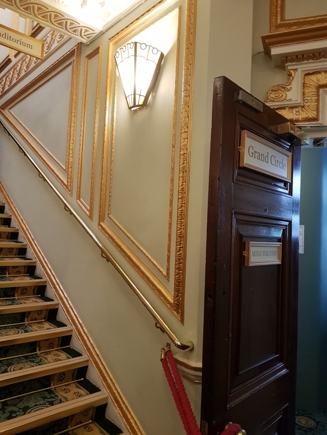 We are happy with the view from the packed Grand Circle: Because the seats do not lift and we must go pass an elderly couple with walking sticks and a highly pregnant lady, we agree that instead they shift up and we take their seats. Later, when leaving, I realise we are sitting in the row where Sennheiser yet again makes a West End show acoustically accessible for people hard of hearing – bravo!