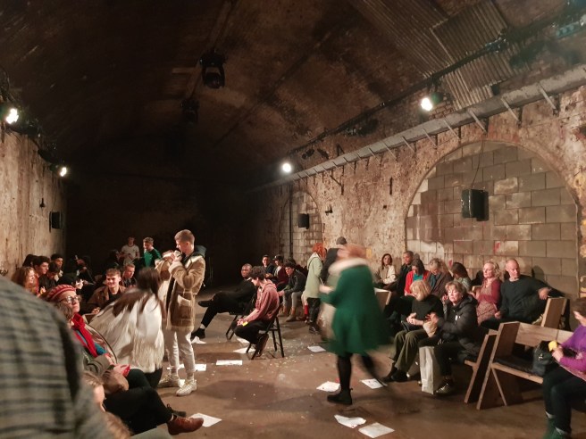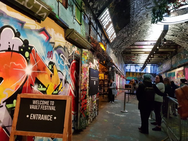 Located just under Waterloo Station, I match anyone to find a venue in London better connected than The Vaults. But because train timetables are still not as reliable as in, say, Japan I arrive at the Vault’s front desk only exactly on time, am then directed through the purple-haired, crunchy wearing Vault Festival crowds and arrive in front of the Cavern with a one minute delay. Memories come back to me of Victoriana themed evenings where you discovered something different going on in every cove and surely of Hair’s first tour stop of their 50th anniversary production.