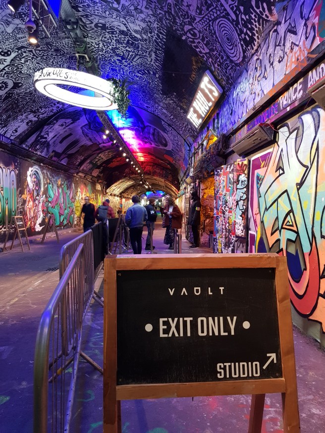 Back at the Vault Festival I realise that many graffities and event-related art works have already been sprayed and tagged over since my visit earlier this month – the Leake Street tunnel under Waterloo Station is an ever morphing organ. I arrive well on time and can therefore venture out further into the labyrinth The Vaults are: Plenty of bars, more stages and alcoves and thankfully finally a women-only toilet. For the Studio, tonight’s space for Shybairn’s Talk Propa, I head back to the graffiti tunnel and enter just next to exit – The Futureheads’ Kate Bush cover of Hounds of Love welcomes us on repeat; Sunderland covering Kent.