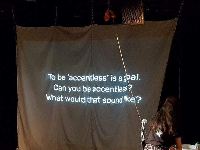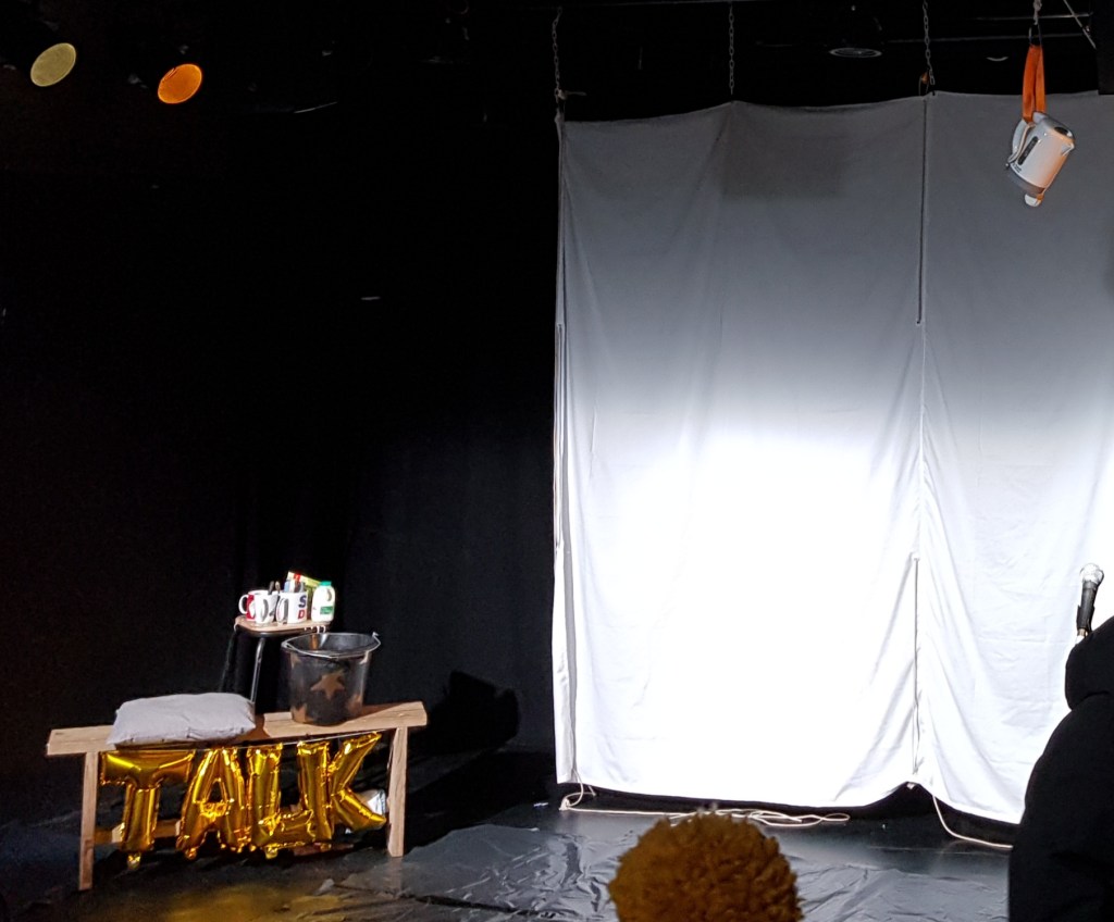 To create the Northern Woman the industry wants, all clichés are literally mixed to a big, messy dough: Tracksuits and fake eyelashes, high heels and wellies, Cheryl Cole albums, Yorkshire puds, tea and so much gravy that they shower each other in it. Stage and outfits require tidying now, quiet minutes pass for far too long. Afterwards a cuppa follows with some audience members and a chit chat about living and working in the South of England with that accent. Above us the commuter trains roar heavily while in the background projected slides accuse the white, masculine elite to shape, demand and accept only a single form of articulation in this country.