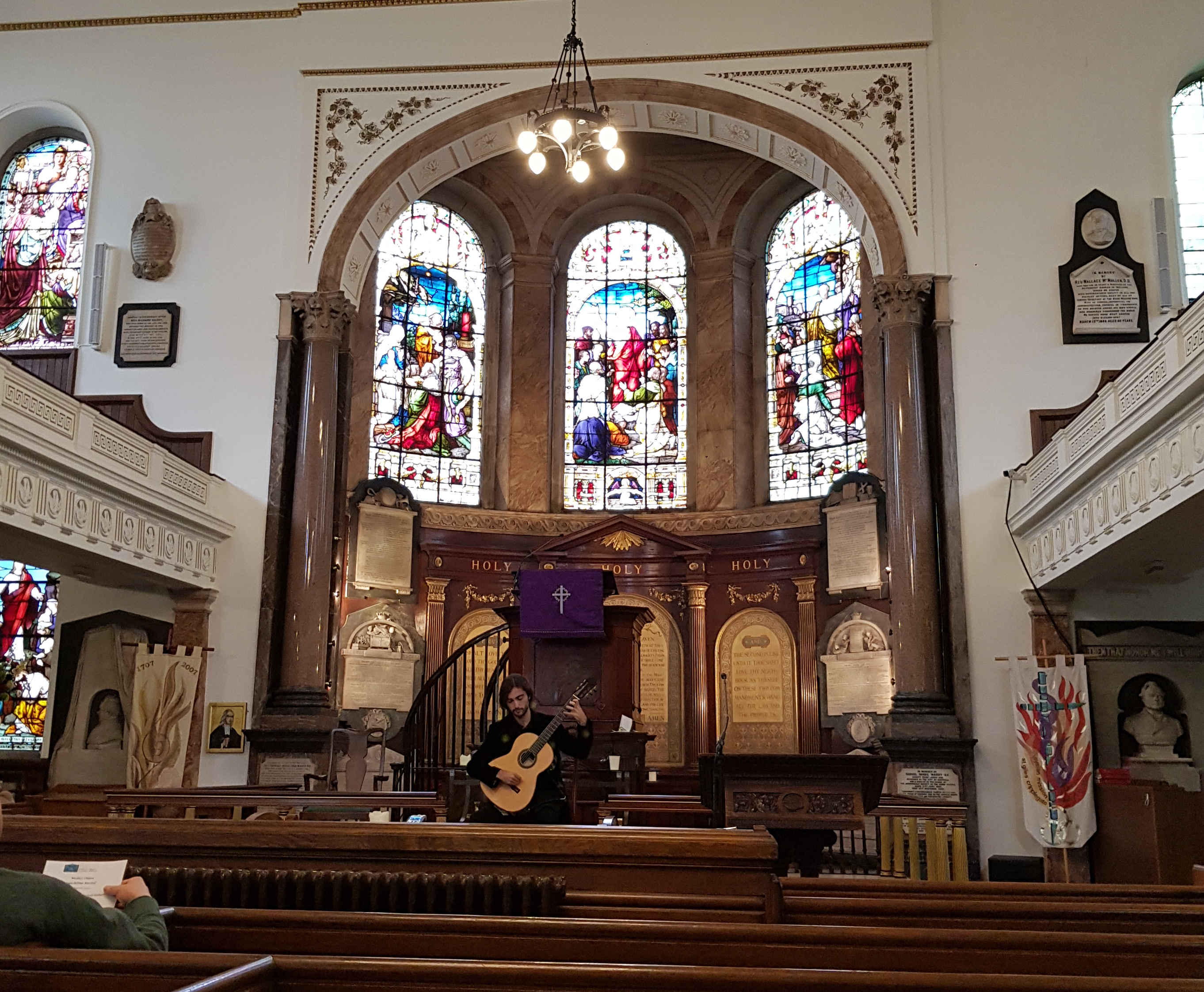 Whenever I can, I pretend I am a tourist in the square mile and walk down routes I have not taken before: I learned about Wesley’s Chapel & Leysian Mission first during a lunchtime stroll aiming for the Bunnhill Fields cemetery opposite – what caught my eye was a poster advertising a Taizé-style service. Having visited this ecumenical abbey in Central France twice as a teenager, I returned (admittedly months later) to the display cabinet and read about Tuesday’s lunchtime recitals. My work calendar did not allow a visit too soon, so I joined my first recital only weeks later. It was balm for my soul. Now I have a reoccurring blocker in my calendar, and these classical music sessions are sometimes my only motivation to get out of bed and come into the office. I remember to take cash with me for the donation box (recently I discovered a machine allowing donations by card) as I embrace this generous offer rather with a pay-what-you-can than a free-concert attitude. Colleagues, carefully approached and then quickly converted, now joyfully join and recognize other regulars in the audience.