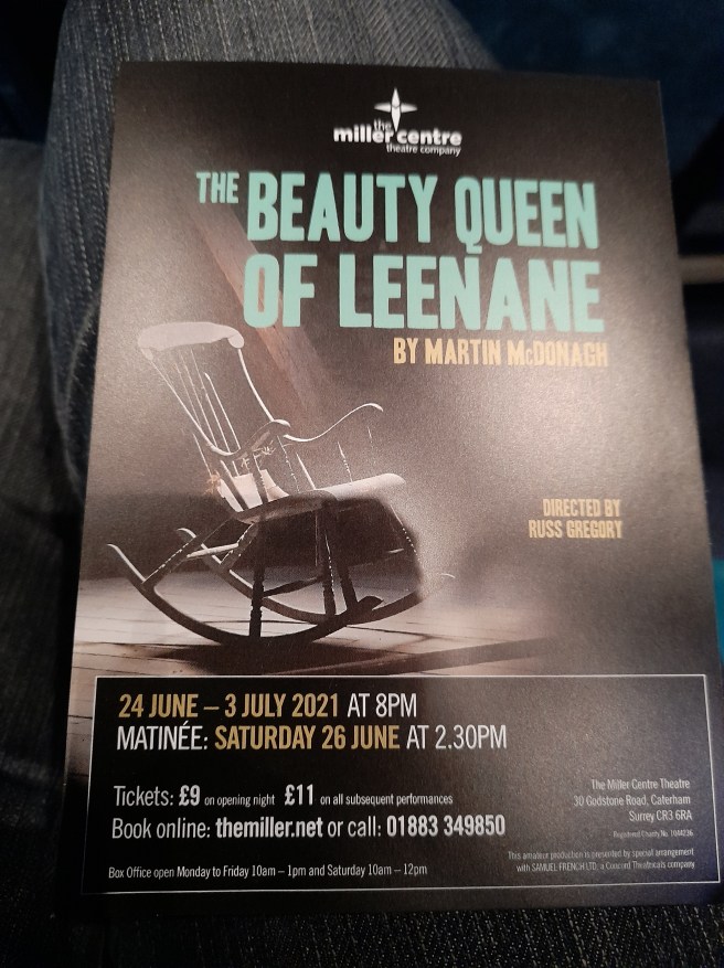 My theatre seat bum has not been to an actual theatre since early 2020, just after I moved to Surrey. With all due respect, it is itching to be back in the audience. After a disastrous first attempt, I am not happy to get on London’s underground too soon again, and instead aim to check out my (not so) new (anymore) local theatre scene – those stages I can reach by train, away from crowds. My first stop is Caterham’s Miller Centre and its amateur troupe, where I catch one of the last of this summer’s performances of Martin McDonagh’s The Beauty Queen Of Leenane. Early last year, I had booked tickets to see this play here with friends, but the pandemic delayed the opening night by over a year. Standing out among other production companies and theatres, the Miller Centre refunded all tickets as soon as possible.