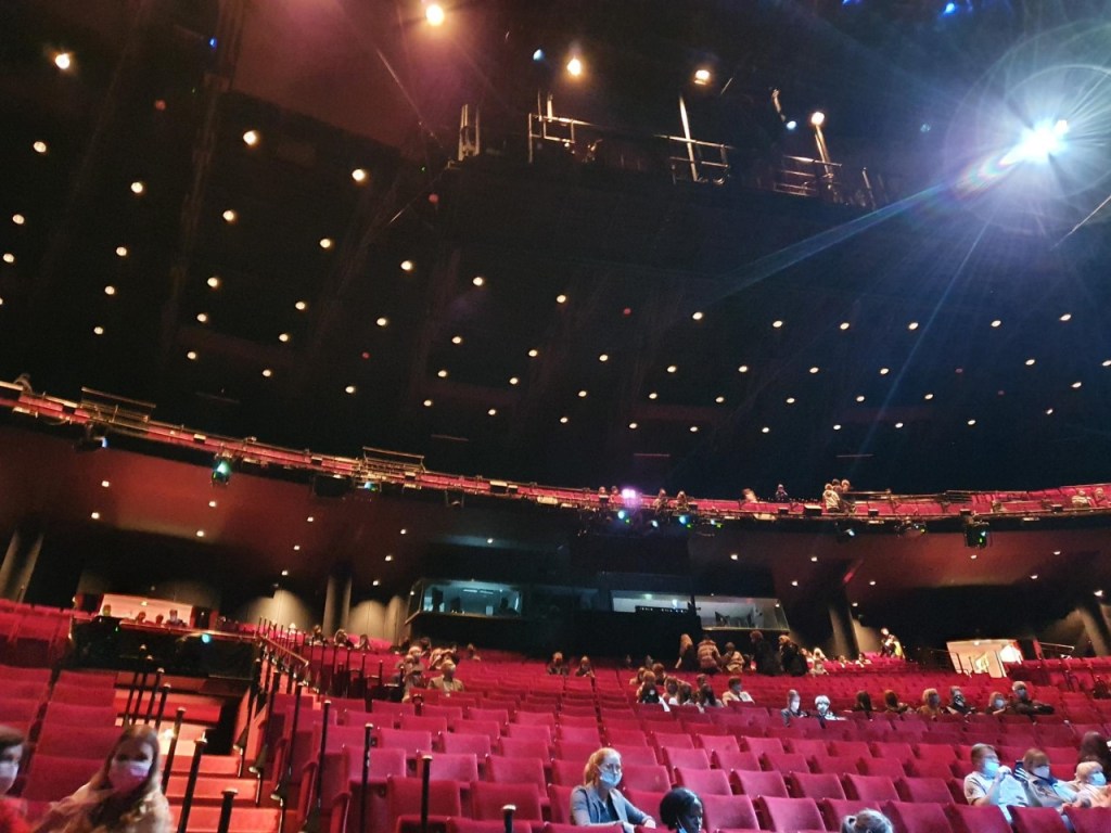 Since I came to the Neue Flora theatre seeing Phantom of the Opera twice (plus a special effect demonstration just for kids) and the German musical Tanz Der Vampire (based on Roman Polanski’s Dance of The Vampires aka The Fearless Vampire Killers), the foyer has moved from concrete to eggshell. We are early to have our bags and vaccine QR codes checked, and the names compared with our passports, and once we got a drink and head to a poseur table, we are allowed to take our masks off during the length of consuming our beverage. Masks are to be worn throughout the performance and I see no one not sticking to that rule. One person even wears the masks over mock Boq ears. The orchestra pit I remember is no longer there, but the wizard’s Big Brother cams give us a glimpse of the conductor and the band during the final applause. Finding our seats in the fourth row takes some confusing counting as the former front row has been dismantled for wheelchairs I believe. Public transport is no longer included in the tickets of private theatres and parking costs a whopping 12,50 Euro for musical visitors. But instead of whinging, everyone seems to be thankful that we can be here tonight.