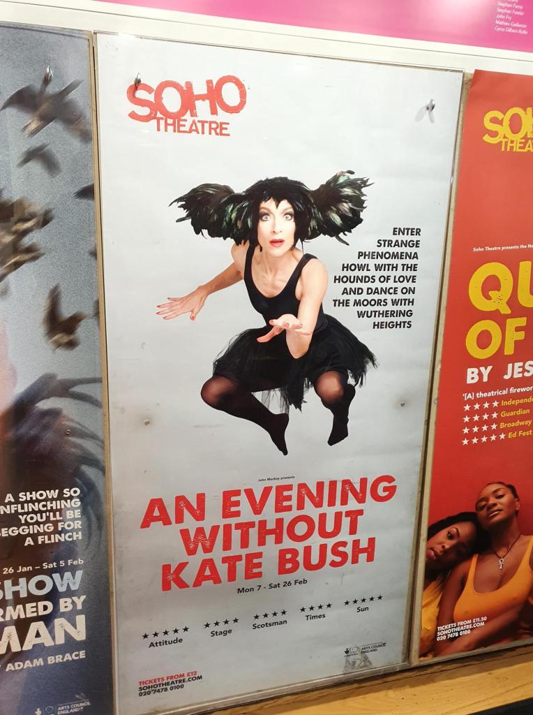 Pre-pandemic, the Soho Theatre used to be my monthly Crick Crack Club haunt (remember those signature magenta-coloured tickets?), but I have not made it to the venue’s downstairs stage so far. We are sitting on red benches surrounding the audience tables and chairs, reminiscing about the little miracle of us going out again and that we were also lucky enough eight years ago to get tickets to see the real Kate Bush during her concert residency. This having been a truly once-in-a-lifetime opportunity, the people we chatted to next to us at the Hammersmith Apollo in 2014 with had solely flown from Los Angeles to see her. Now, over two years after the tickets to an evening without her have been paid for, I wonder if the collective thought of Kate Bush being in the audience is going through the Soho Theatre’s downstairs. She surely will find a suiting incognito. She might have been even on stage. With Kate Bush, you never know what comes next. And when.