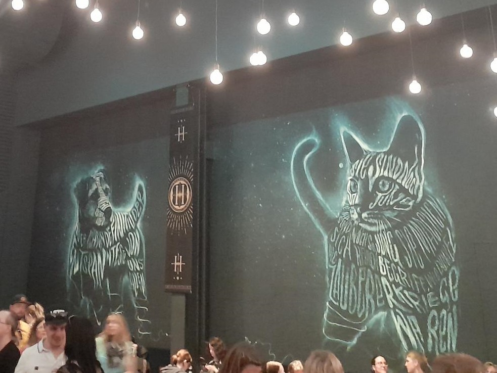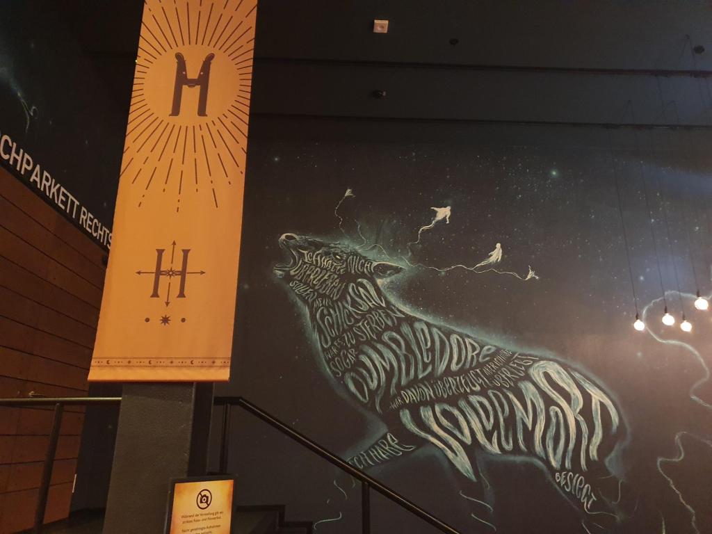Hamburg’s Potterheads celebrate House Pride Week and we are visiting on Hufflepuff day. My basic Potter knows Cedric Godric and Luna Lovegood as those wearing the yellow Hogwarts uniform, but I rely on the decorated banners everywhere, promoting the houses’ values for selfies and other photo opportunities: Hard work, patience, justice, and loyalty. Worth paying attention, the foyer decoration will be updated during each break. What stays are huge, beautiful murals of patronus animals (the totems of JK Rowling’s fantastic universe) and I expect to see airbrushed tattoos of these masterpieces in a year’s time here – they are absolutely stunning!