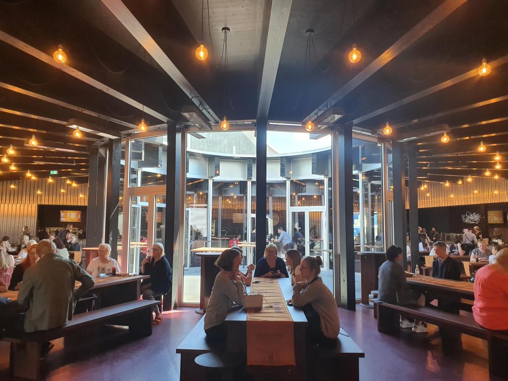 Declining the restaurant offers we could have booked with the seats, we ended up with some Asian noodles in a street corner imbiss about ten sunny walking minutes away from the theatre, discussing the cliff hanger and how glad we were that we did not have to wait for days now to see how the adventure concludes (the option to watch the second part on another evening is available). To eat from a variation of informal eateries would have been available within the theatre area as well, with shared tables utilised to enjoy coffee and cake, pizza or fish and chips, and to escape the weather. Next to us, some well-prepared Austrians are concentrating on their Yatzy session.