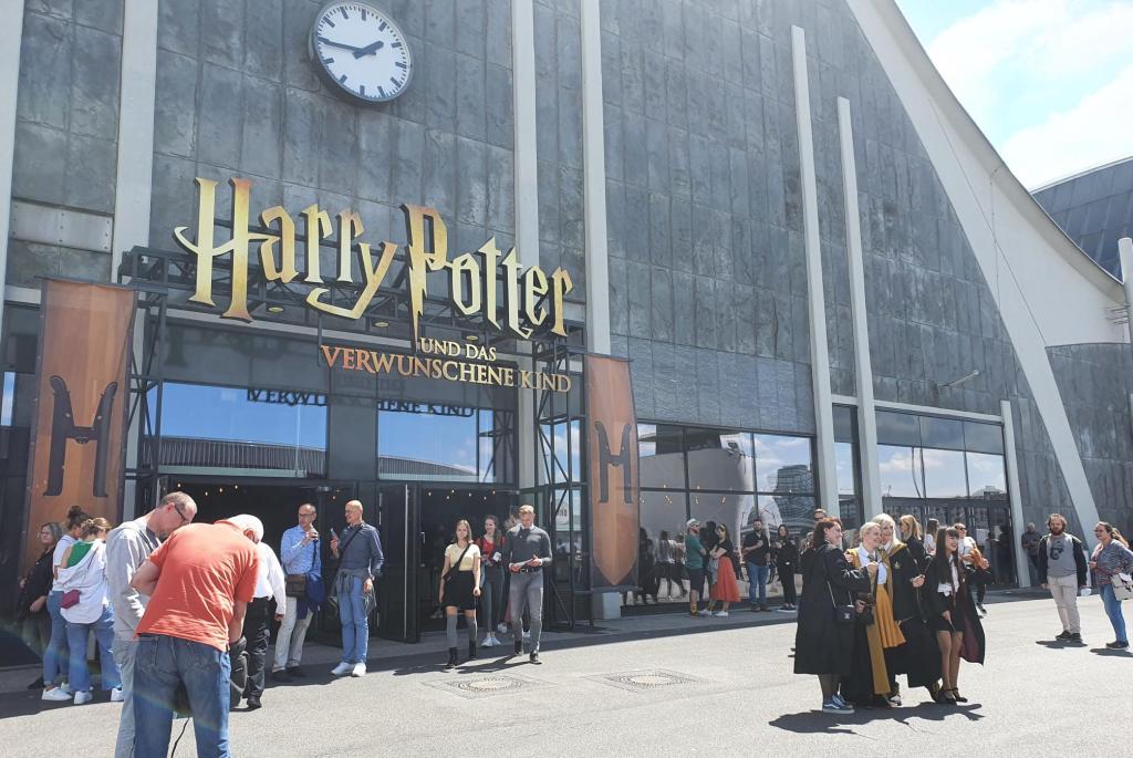 No matter how creative the announcements are to switch off mobile phones before each part, I hear ringtones in each – shame on you, Muggleworld! Leaving the venue in the late yet light midsummer night, we are handed out a reusable Hufflepuff goodie tote containing a poster, cup, a button and a postcard. Public transport is usually included in Germany’s theatre tickets but because of the incredible 9 Euro ticket campaign for the whole of the Bundesrepublik this June, I do not even check if it is. Organising one of the longest theatre days (with no real hope for a discount opportunity) takes some planning, especially in times of flight cancellations. All we did was keeping the afternoon free: Ordering our tickets online on the very morning of us visiting both parts in one day is not problematic. We commit to 4,5 hours of performance, a 20min interval in each part and between those, a break of 2,5 hours.