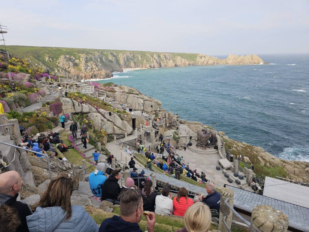 We admire the speakers and light arrangements some daredevil of an AV technician has set up here. And fire cannons – no wonder I was advised to watch the evening rather than the afternoon performance. The stage is far beyond us but that will not matter: The view over the sea and Logan Rock (which we climbed the previous day) is so mind blowing that I will forget that a performance is put on at all during some moments tonight – any performer, any script, any staging has strong competition when playing at the Minack Theatre!