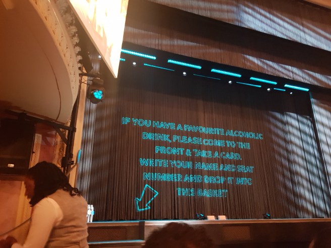 Even before we are seated the full house is very busy. While wedding bands are measured, plenty of tasks and errands are being distributed to audience members, cards filled out and put in a basket on stage: This energetic buzz will not really calm down over the next two and a half hours, especially not during the insta-story worth interval (by the way, have you observed the venue’s façade from the higher stairs of the Piccadilly Circus statue? Might worth a visit after leaving, just saying).