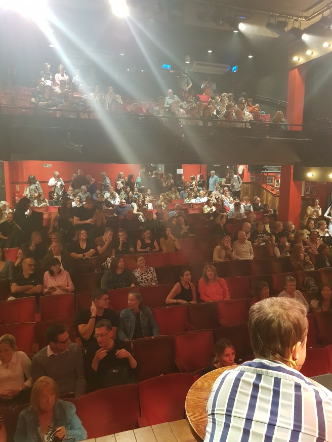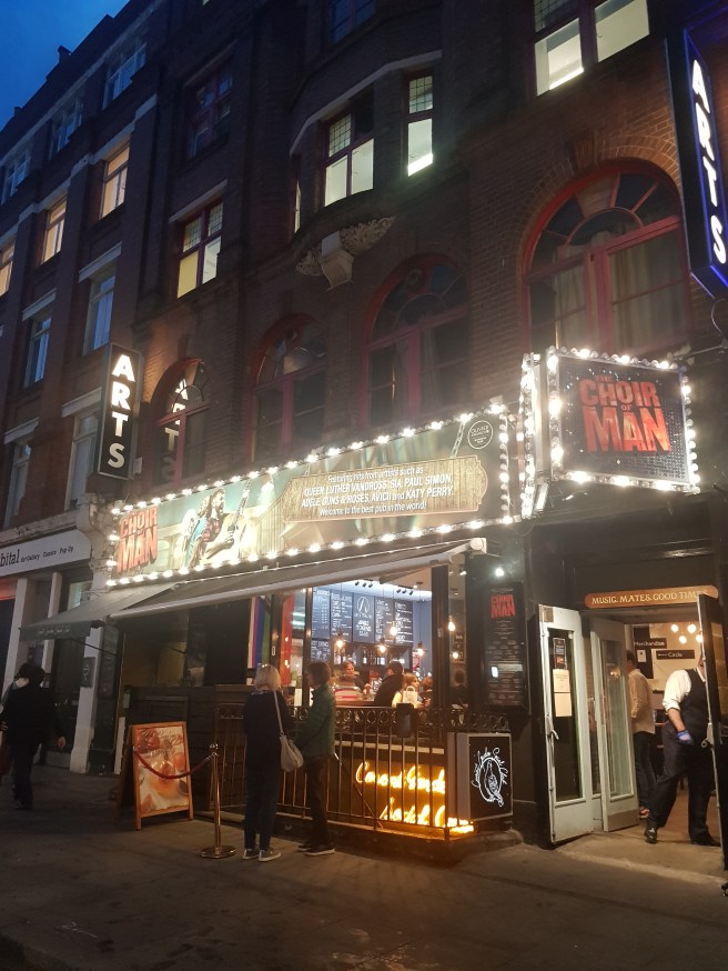 Personally, I am preferring the new, less bromance-bravado cast to the one I saw in April which might have had slightly better vocalists but whose performance and companionship appeared a tad too choreographed. What happened tonight on stage however felt much more organic, maybe because I went on stage myself instead of the foyer bar to grab a drink. I also prefer the seat up in the circle to the one in the stalls – less chance of singers passing you a free beer or bag of crisps mid-show but also less risk of being drawn on stage. On both levels, the full house audience tonight is roaring: This show is a party. Afterwards I took the time to have a pint in the pub I had my first ever beer in London, only a few doors down from the Arts Theatre. I am glad I gave the Choir Of Man another shot.