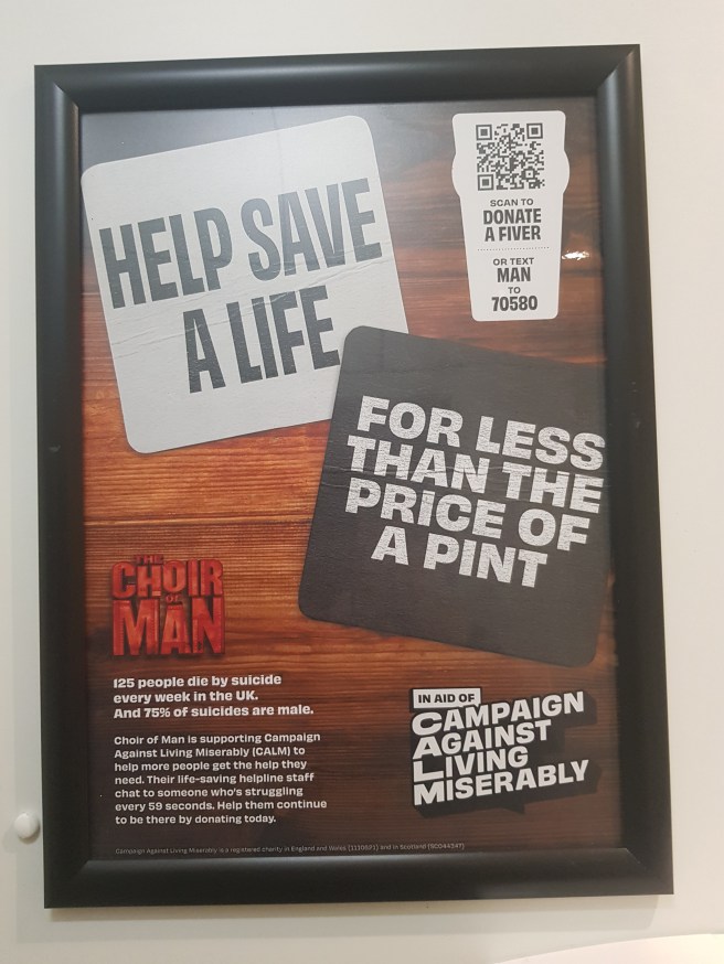 Of course I am in support of a first anniversary celebration dedicated to the suicide prevention Campaign Against Living Miserably who have crossed my stagy paths more than once before – the jukebox musical Choir Of Man is sharing some limelight with CALM, now having completed their first year in the West End. After all, the day correlates with World Mental Health Day. In full support of CALMs mission, I even have dedicated change ready for the announced post-show collection – only to learn that this is now mainly done via credit card, with a single bucket at the exit for cash. 2023 in your face.