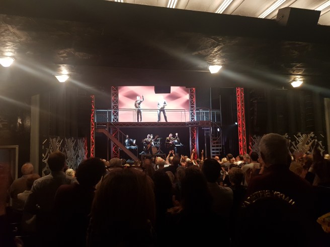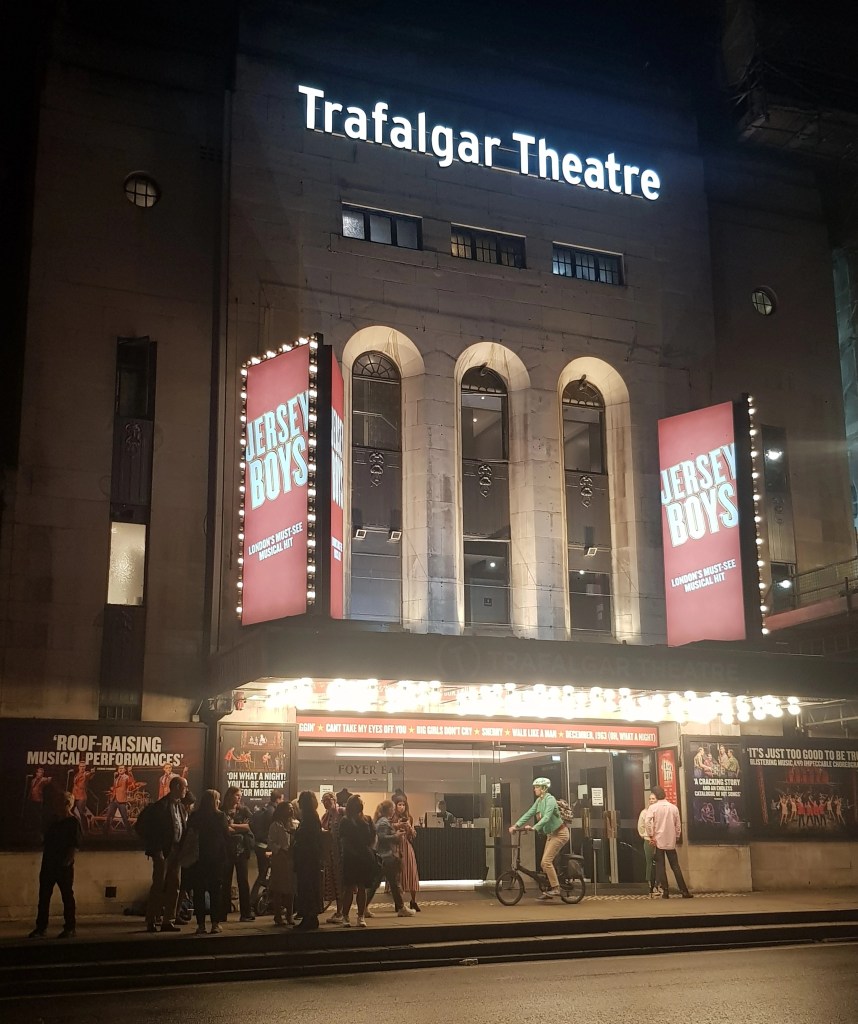 In the end I learn already via text message on the Friday before that we will see the tribute show Jersey Boys, the band biography of the Four Seasons, an American combo from the 1960s of which we recall some songs when searching them but not a single member, let alone anecdotes or scandals. Bonus for me, it’s a first visit to the Trafalgar Theatre and hey presto, tickets in row zero – usually the B ticket category one just in front of the stage, so just before the first row. The Trafalgar Theatre has a couple of retro art deco features and plenty of Broadway fonts in black and silver, a modern rather than a classic West End glam theatre, nodding to its favourite eras. But we quickly realise we are in row O (the letter, not the number), with the sound desk behind us. One does see well here nevertheless.
