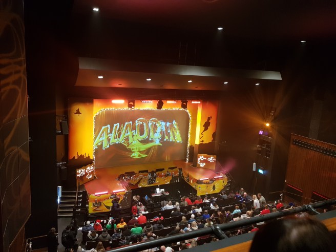 This evening the venue hosts two shows on its stages: While an inclusive production about a Pinocchio who is happy as he is and does not want to be turned into a real boy is of high interest (also given the fact that most performers are disabled), we are here for the pantomime Aladdin. Sigh: The day before this little stageblog went life I went to my first panto (Sleeping Beauty in Windsor as you asked), and admittedly I have avoided it since, bare the adult panto Tinderella on a girls’ night out. Adult panto did not become part of my advent routine.
