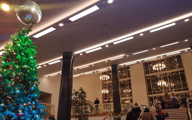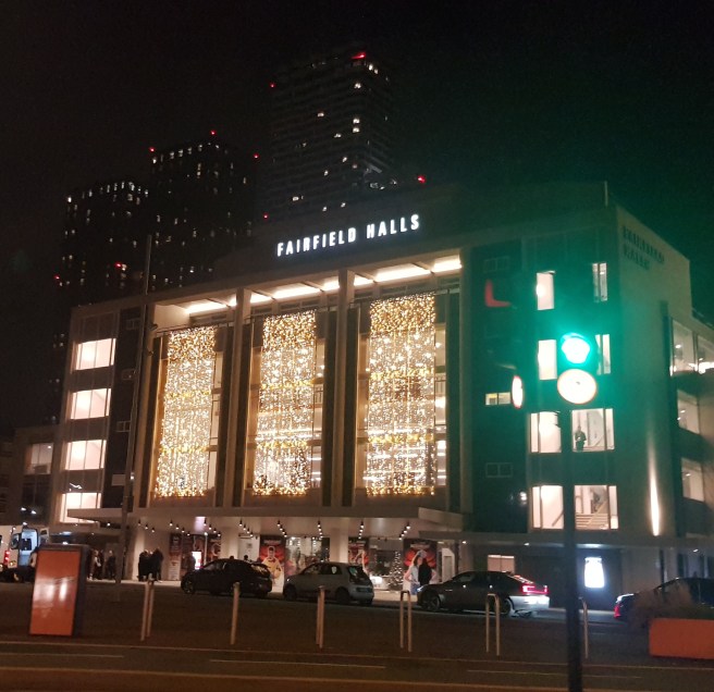 On arrival from the vaults of its car park, the massive multilevel foyer of the Fairfield Halls in London‘s Borough Of Culture 2023 Croydon is breathtakingly busy. People in Christmas hats and jumpers take family pictures on almost every corner, in front of fairy light curtains, on stairs and the funky Christmas trees crowned with disco balls, enhanced by rainbow clavilux. Stalls sell frozen drinks, ice cream and glowing toys expected to be wielded by younger theatre goers all evening. None for me today, I have been equipped by my little fellow reviewers with snap light bracelets and even a ring; this will bring applauding to a very different level. It will indeed!