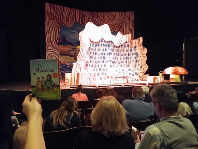 All of us are eager for the show to begin and to stuff our mouths with the loot from last night’s trick and treating – that’s exactly how the family behind us does it as well. Since yesterday, no one amongst us is afraid of the dark anymore, definitely not of the dark in a cosy auditorium. But just in case, stuffed teddies have been brought for comfort because it is still a play about baddies and to quote the promotional poster on the free souvenir programme and on the book’s blurb: “They’re funny… They’re silly… And they’re really, really bad”.