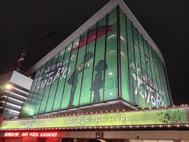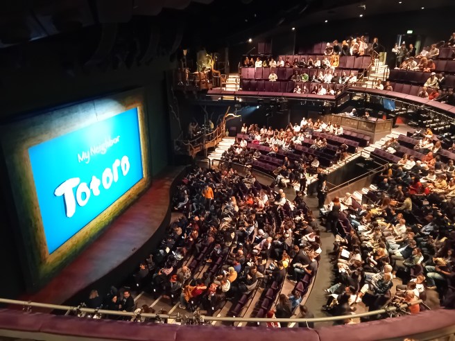 It is a busy weekday performance. Maybe this is the reason why we not see a single cosplayer in the brutalist foyer, and only a single child. In our row we discuss how kid-friendly the lush 2,5 hour long production is: While it clearly does not exclude children, it would overwhelm the attention spans of most primary schoolers we care about. The sheer size and volume of the cheeky but never ill-mannered forest spirits two sisters befriend after a move to the countryside might well have been too much for them.